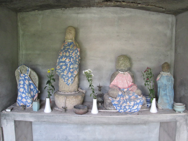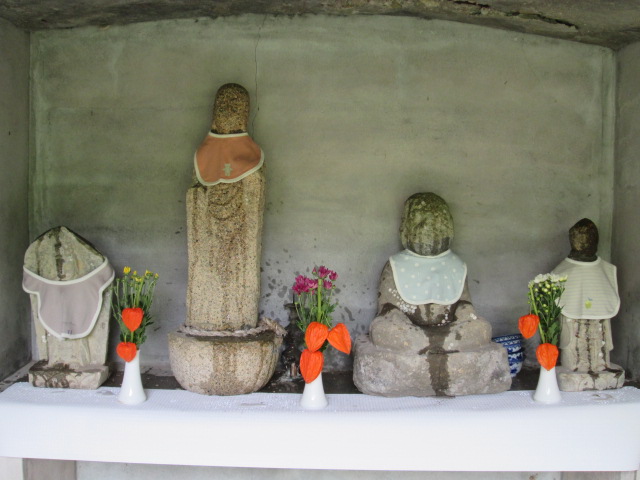 お盆まえに裏のお地蔵さんの大掃除をして、前掛けを新調しました。「商売繁盛」「家内安全」の御利益は確認できませんが、「恋愛成就」の御利益はあったそうです(関係者談)